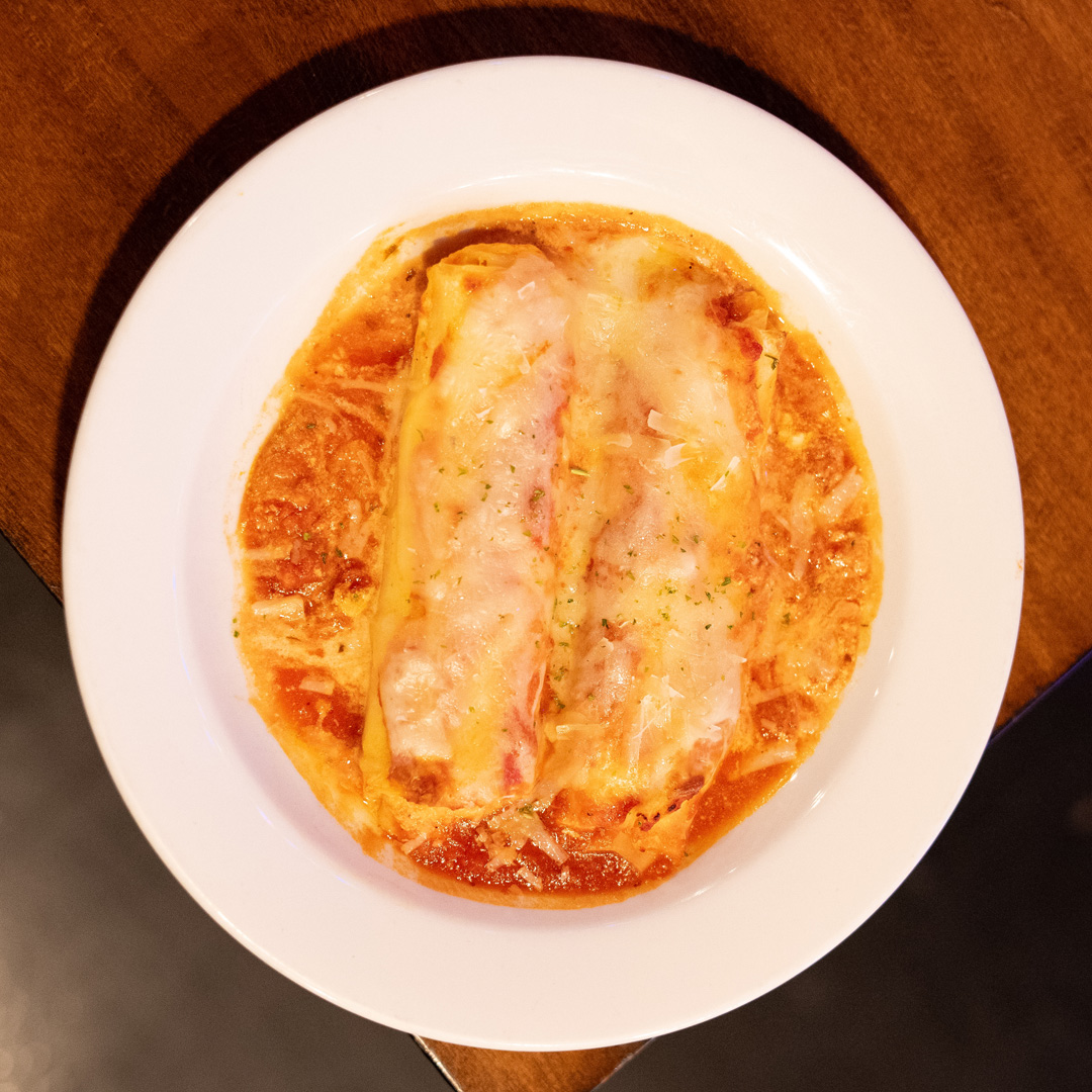 Rolled pasta stuffed with lobster meat, crabmeat, shrimp, scallops, and ricotta cheese, baked with aurora sauce