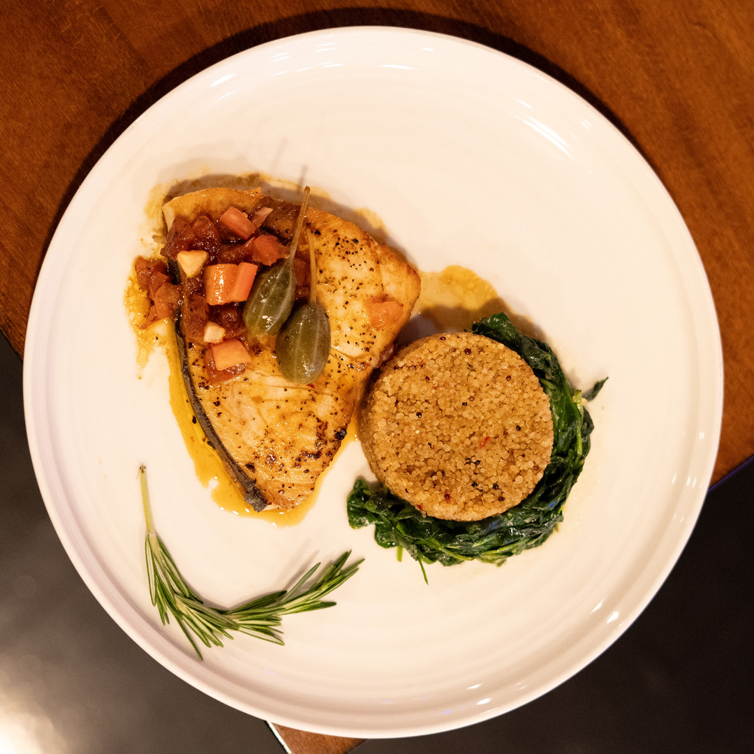 Served with quinoa and sautéed spinach, finished with a tomato–caperberry butter sauce.