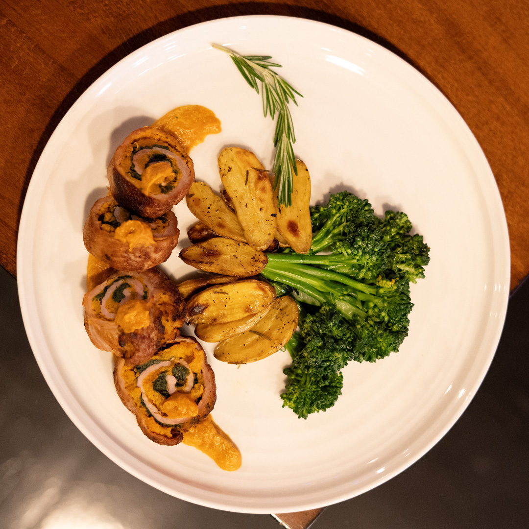 Pork tenderloin layered with butternut squash and spinach, rolled and seared, served with herb fingerling potatoes and broccolini, purée of butternut squash sauce