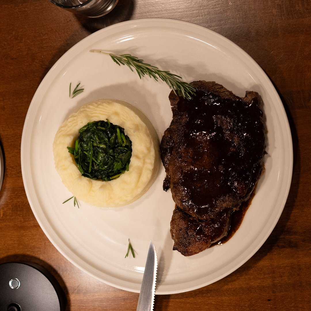 Grilled 12 oz ribeye served with mashed potatoes and sautéed spinach, finished with a demi-glace sauce.